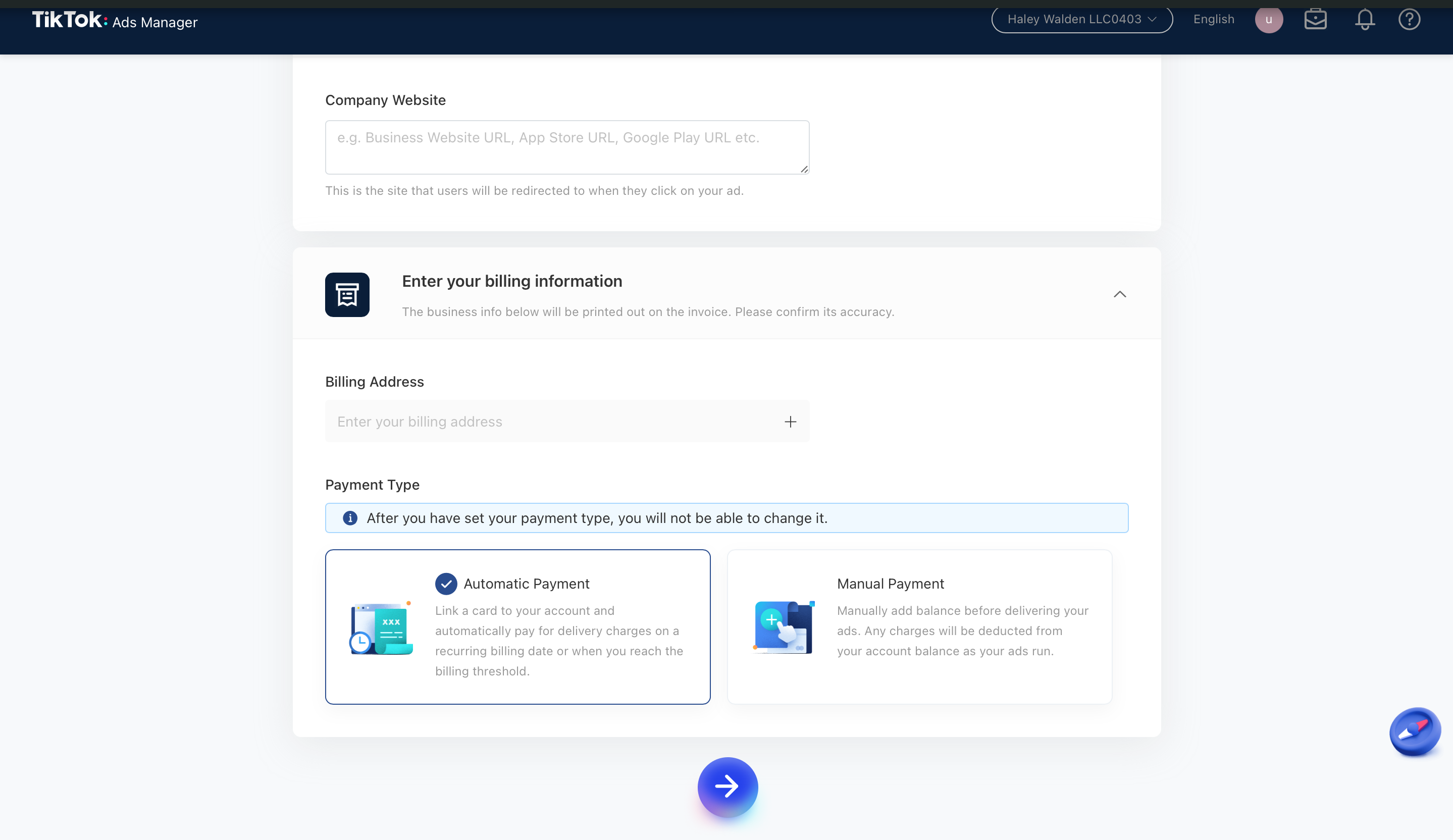 5. Now, you’ll need to enter your payment and billing information. This information includes your mailing address, and the platform will ask you whether you’re an ad agency. You’ll also need to choose between manual and automatic payments.