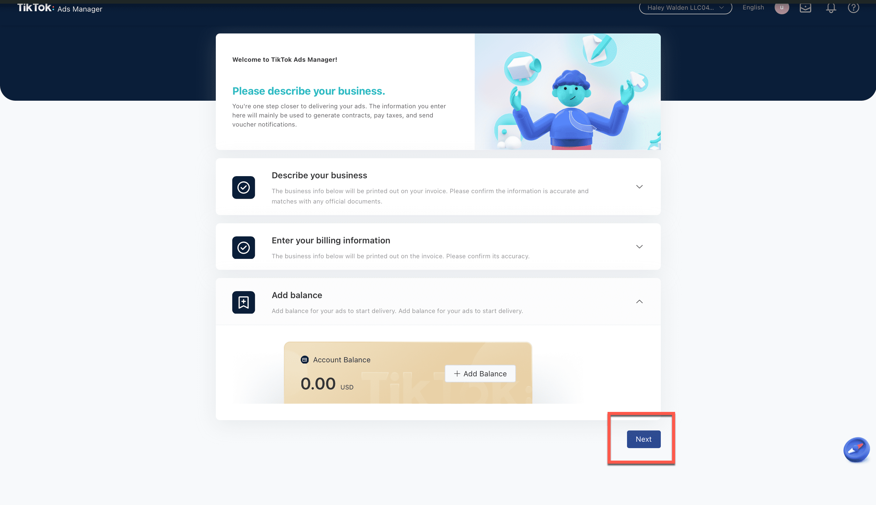 6. Once you’ve entered your information and decided how you want to pay, then you’ll see a balance of $0. You can choose to add money to this balance now, or after you’ve created your ad. Click Next to continue.