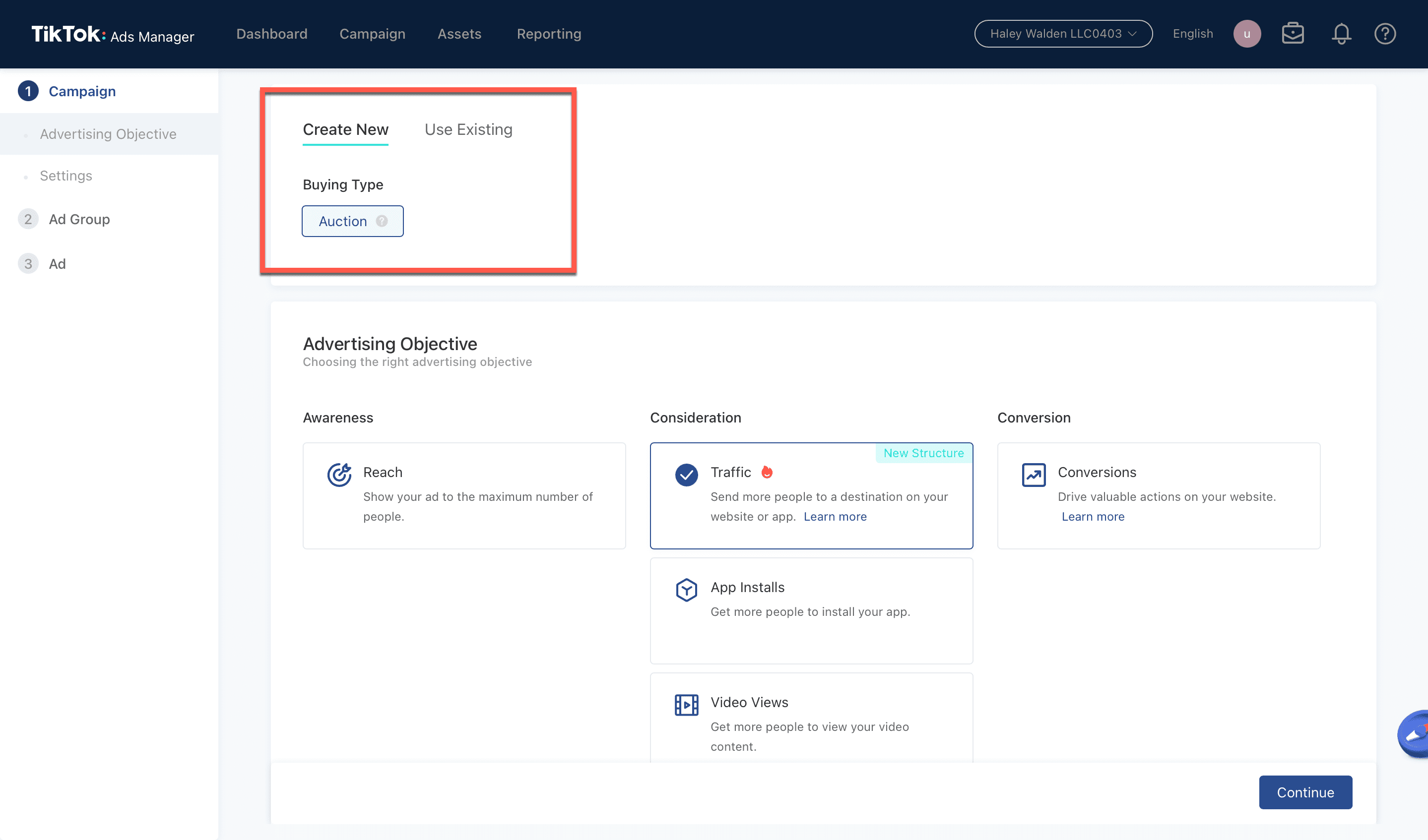 7. Now, it’s time to determine your advertising objectives. Under Create New Campaign, you’ll see that your buying type is Auction. When you put your ads in an auction through TikTok advertising, you can choose a strategy for bidding that will help you to meet the objectives of your campaign. This goal could be efficient budget spend, or controlling the cost per result on your campaign