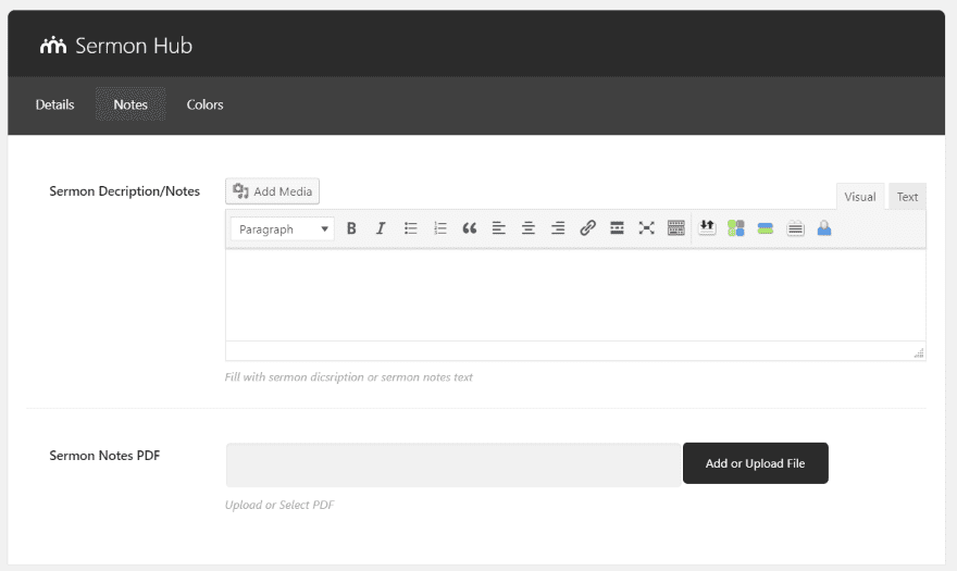The Notes tab includes a visual editor to add a description. Just like the WordPress editor you can add text and media. It also has a field where you can upload a PDF file for the sermon notes. This will be available as a download to your visitors.