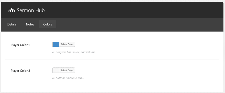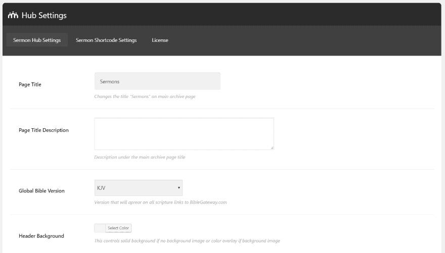 The Hub Settings tab is where you set up how the plugin will work with your website. Here, youβll set the page title, description, choose the Bible translation that the references open to (choose between KJV, NKJV, ESV, and NIV), choose the colors for the header text, links, backgrounds, the player controls, adjust the header height, set a background image, choose to show tags and filters, and set a default cover image (which appears for any sermons that you donβt upload an image for).
