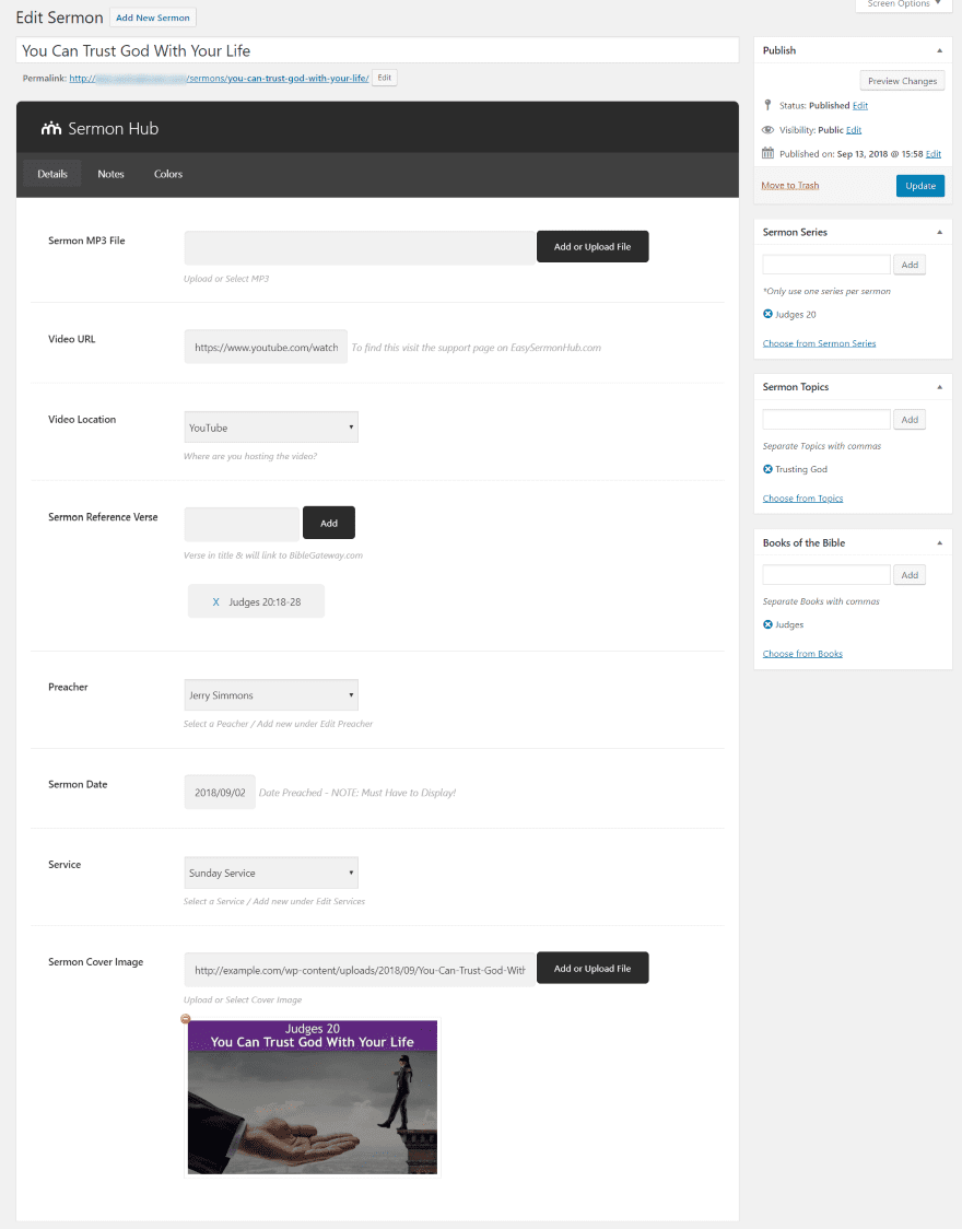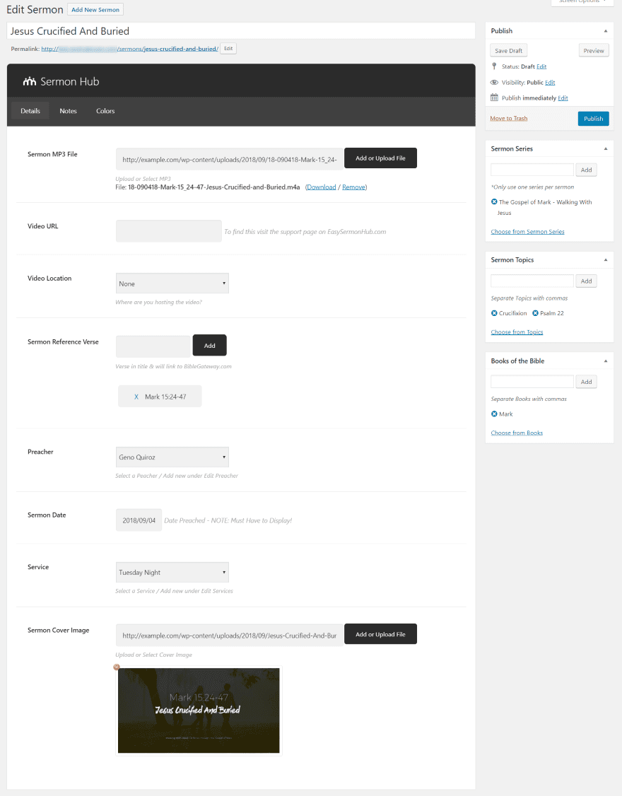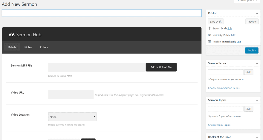 Adding a new sermon opens an editor with features similar to creating a post. Along the right side, you can publish, add a sermon series, add sermon topics, and add the book of the Bible. These work the same as categories and tags. The sermon editor includes three tabs: Details, Notes, and Colors.