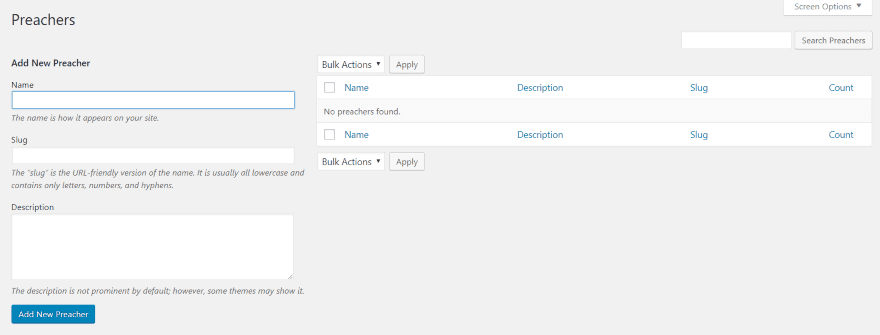 Adding Preachers works the same way as adding categories, except that you canβt add them from the sermon editor. Youβll need to add them first and then you can select them when you create the sermon.