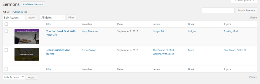 The sermons list includes all of the meta information that I added. Click on edit to open the editor or you can do a quick edit from here.