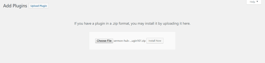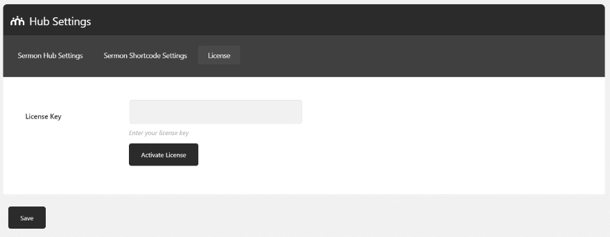 Click on the new menu item called Hub Settings. Select the License tab, enter your license key, and click Activate License. It adds a new post type called Sermon that can be accessed from the WordPress drop-down menu bar under New, and from the Sermon Hub menu in the dashboard.