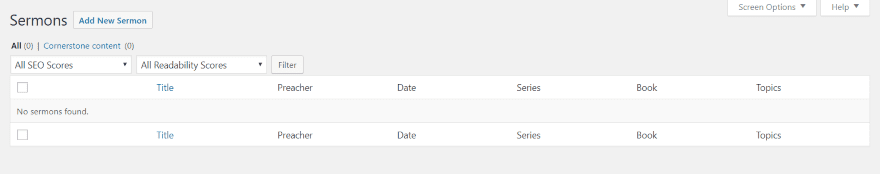 The Sermon Hub dashboard menu provides the sermon editing options. Create a new sermon, see the sermon list, and edit preachers, series, topics, books, and services. In this example I have Yoast SEO installed and itβs providing filtering by SEO scores and by Readability Scores.