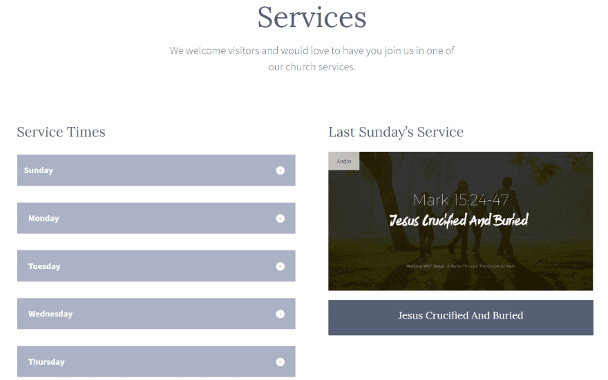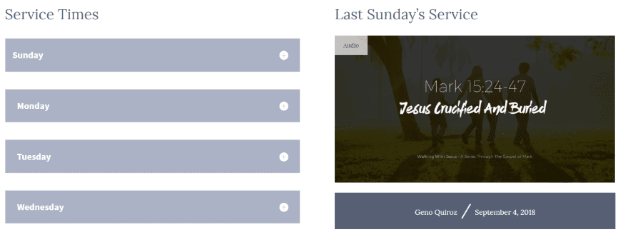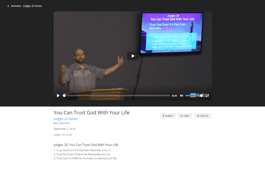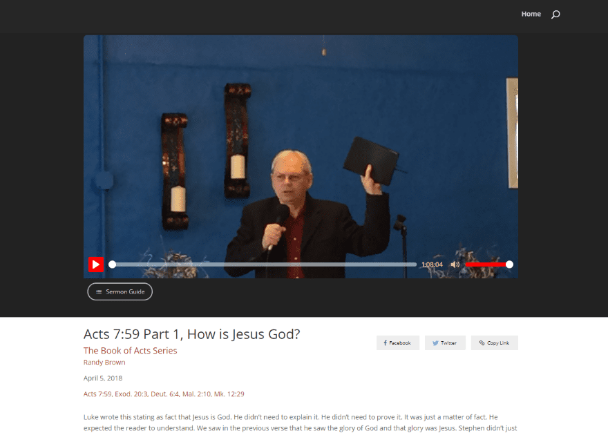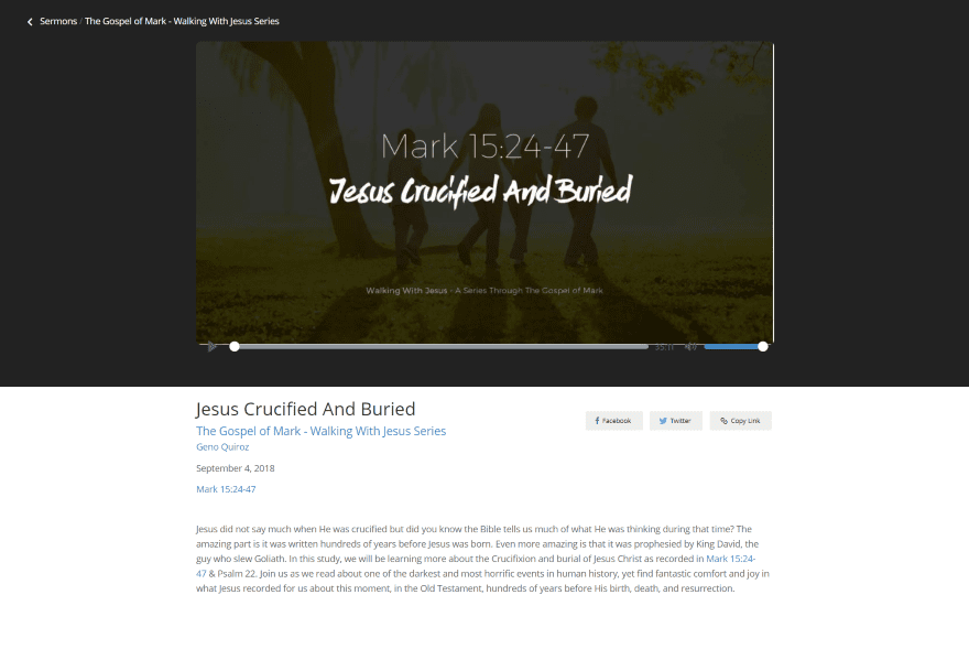 The individual sermon pages add breadcrumbs for the sermon navigation to the top of the page and add a dark background. The title, preacherβs name, and Bible references are clickable. Clicking on the Scripture references takes you to Bible Gateway. It also adds Facebook, Twitter, and copy link buttons for sharing on social networks or send a link in an email. This is the audio sermon. All of the elements are customizable.