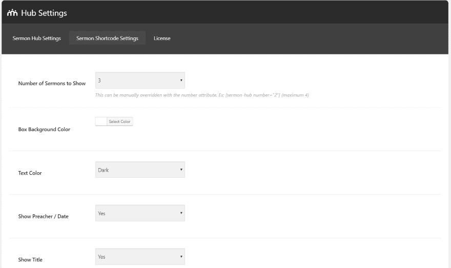 The Sermon Shortcode Settings tab lets you choose the default features for the shortcode. It includes the number of sermons to show (which can be over-ridden manually within the shortcode), the background and text colors, to show the preacher and date, and to show the title.