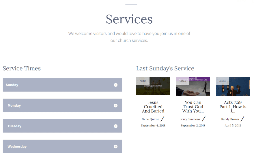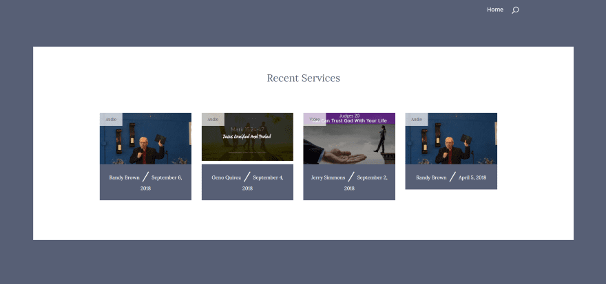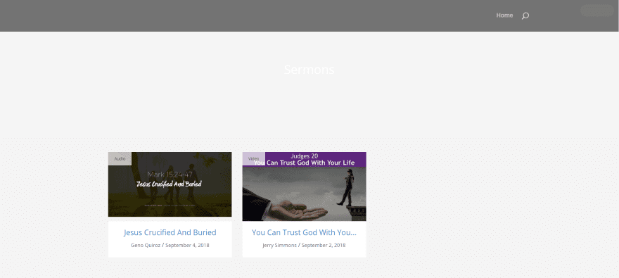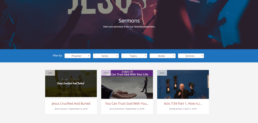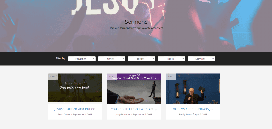 Iβve added some customizations to the sermons page. I changed the title to dark text, added a description to the page (which appears under the title), added a header image (from Unsplash) and transparent overlay, and added the filters. You can filter the sermons by preacher, series, topics, books of the Bible, and services.