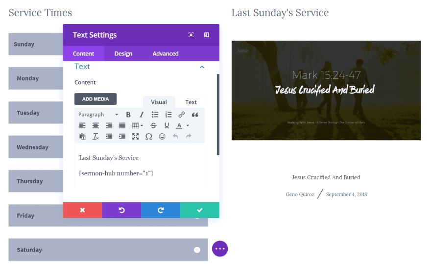 Services will also have to be added in their own editor before they can be selected in the sermon creation editor. This is useful to separate morning and nightly services and special occasions.