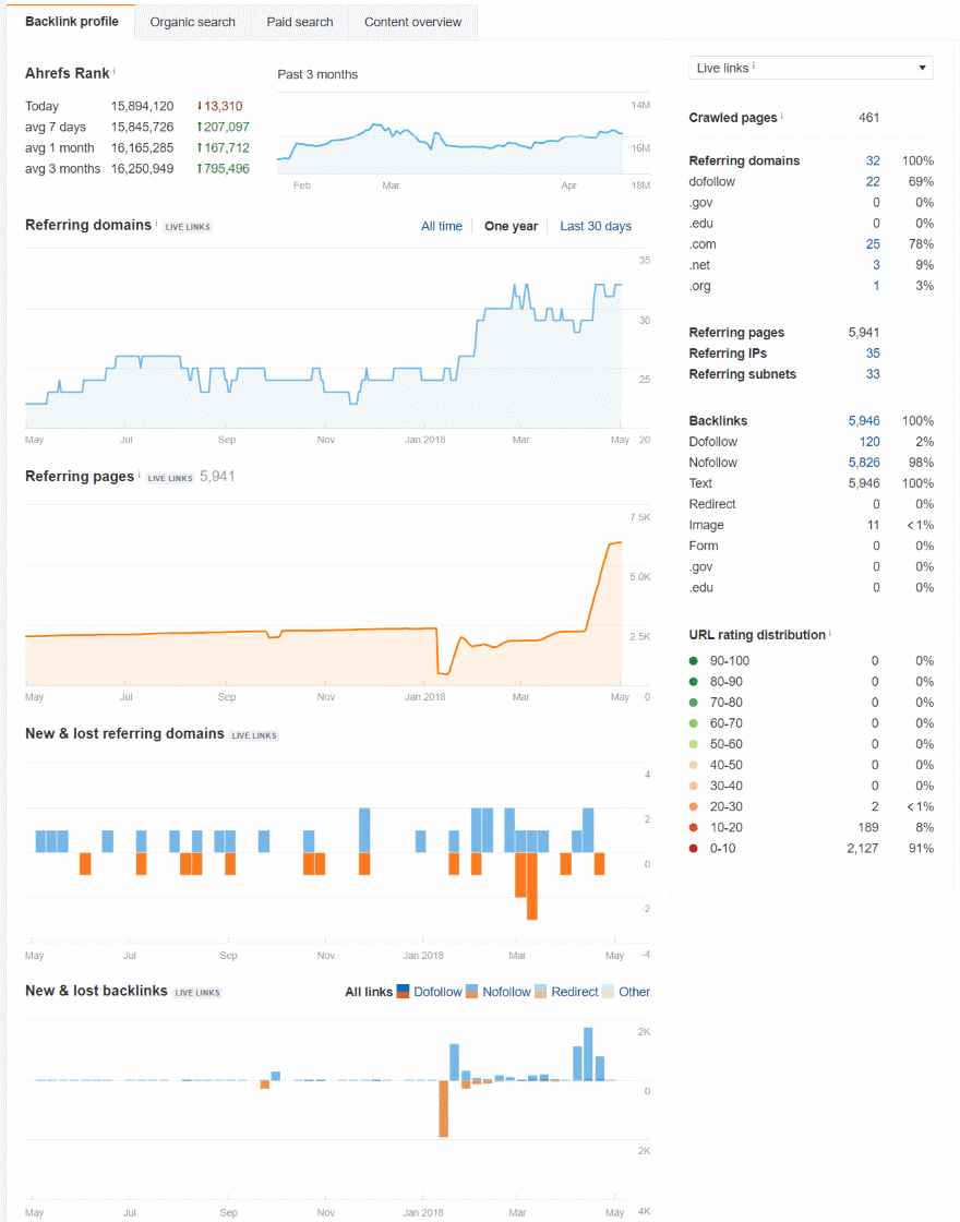 This is a snippet of what the Backlink Profile shows. It provides charts with your rank, referring domains, referring pages, new and lost referring domains, new and lost backlinks, CTLD’s distribution, an anchors cloud, anchors phrases, and anchors terms. Each element on each chart is hoverable and you can get more information and full reports sent to your email. To the right you can see information for follow, no-follow, etc.