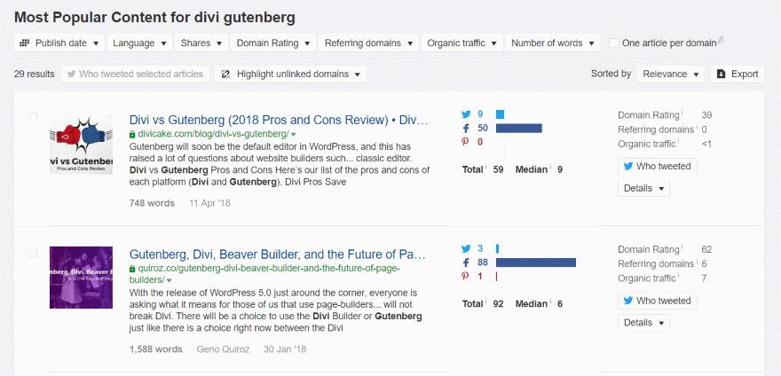 I searched for Divi Gutenberg and found several interesting articles (my website was number 13 on the list, woohoo!). It provides a thumbnail image, title, URL, snippet, number of words, author, publication date, social shares, and domain information.