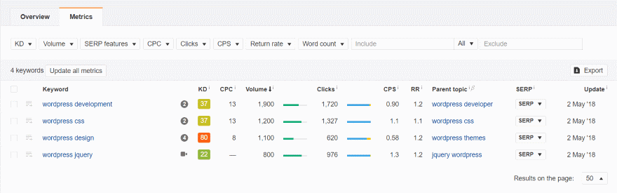 Metrics gives you the details by each keyword. These are the 4 keywords that I searched. It shows the keyword difficulty (how hard it is to get into the top 10 on Google), cost per click, search volume, number of clicks, clicks per search, return rate, parent topic, search engine results page, and the date the keyword search results were last updated.