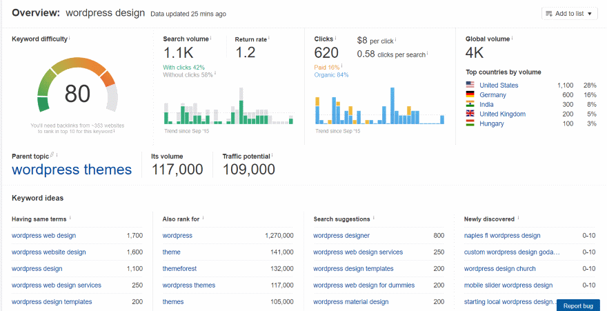 Keyword ideas shows keywords that use the same terms, other keywords that the top ranking pages ranked for, suggestions to search for, and newly discovered keywords. You can also see top countries by volume, traffic share by domains, and traffic share by pages. This is one of the most useful tools because I don’t always know what other words to search for and this does it automatically.