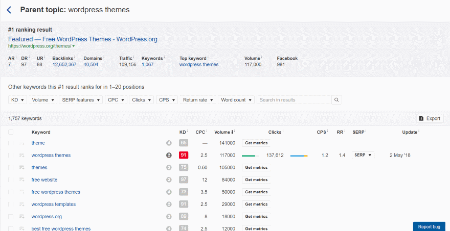 Clicking on a specific keyword provides you with detailed charts about the keyword. It also shows search volume, return rate, clicks, prices, and global volume. Under this is the parent topic with its volume and traffic potential, followed by keyword ideas, SERP position history, and a SERP overview which includes the highest ranking pages. This is excellent for seeing information about your competition.
