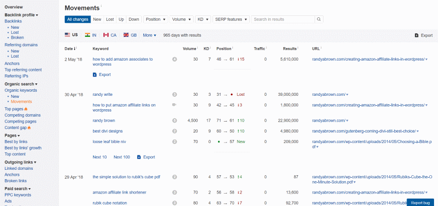 Movements (under Organic Search in the sidebar) shows where your position has changed. It includes your monthly traffic and total results for the keyword.