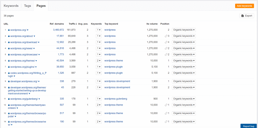 You can also see tags and pages. Here’s the list of pages that rank for the keywords I tracked. It provides the number of referring domains, traffic, average position, number of keywords, top keyword, volume, and position.
