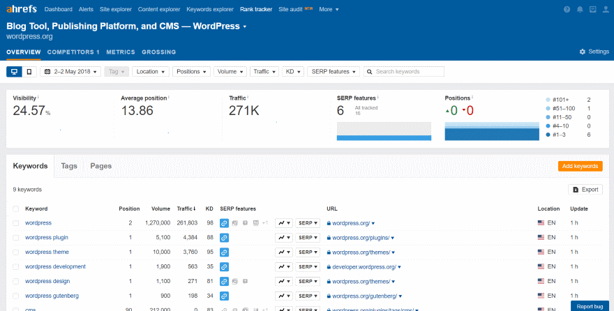 The rank tracker shows the website’s visibility, average position, organic search traffic, number of SERP features, and the number of keywords that have changed position. Under this is the keywords that I’m tracking along with the tracking data.
