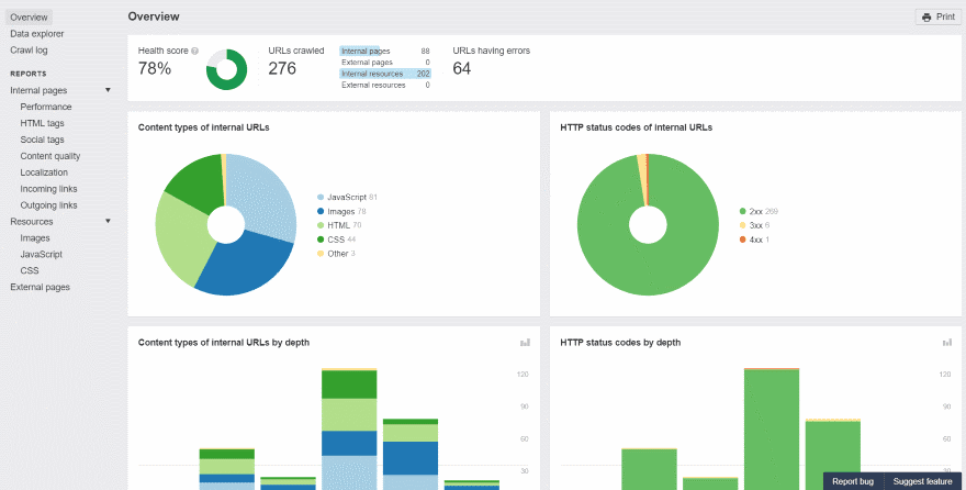 Overview provides a health score and shows the content types, status, etc. You can also view the data explorer, crawl log, reports, resources, and external pages.