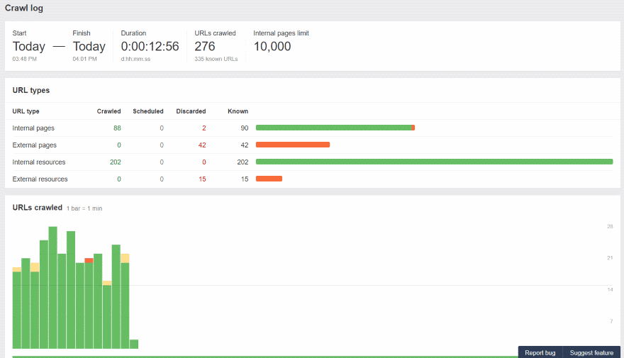 The Crawl Log displays the start time, duration, URL’s crawled, and the internal page limit. The URL types show internal and external pages and resources with the number of crawled, scheduled, discarded, and known pages. It also displays the latest URL’s with the time, status, content type, load time, size, outlinks, and URL.