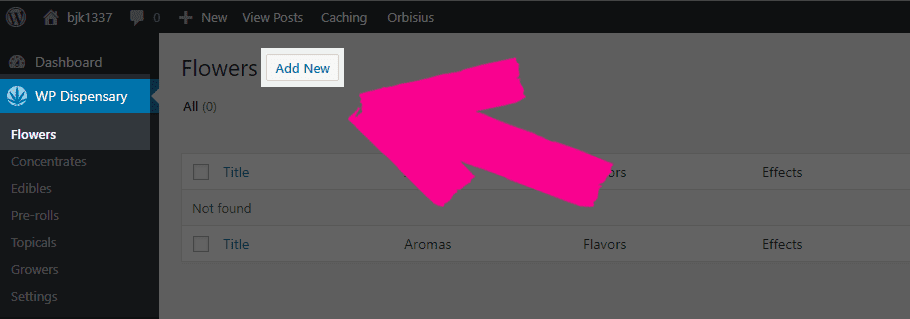 To add a new Flower (or other menu item) to the WP Dispensary menu, click the Add New button when you’re inside the Flowers tab.