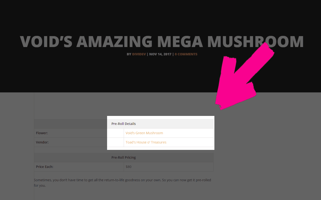 And what’s awesome, really, is that the links are contextual. So for instance, if your dispensary has a pre-rolled product made up of something like the Void’s Green Mushroom that we created above, you make a new product for it, choose a category and what flowers are in there, and you get directly linked to the details automatically.