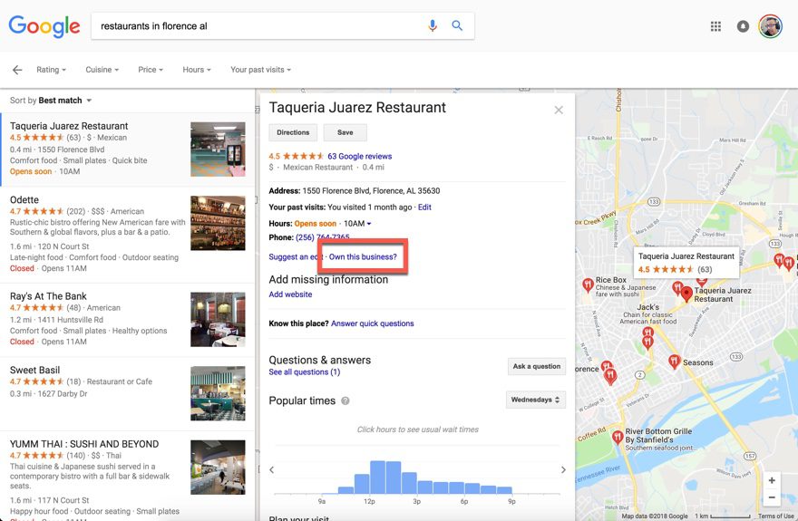 You will have reviews, location, maps, questions, website links, phone numbers, etc. on the page. The ultimate NAP, really. Additionally, this information is aggregated by Google automatically, but you can take an extra step. I have highlighted the “Own This Business?” link in the image above. You can get much more out of your GMB page by claiming ownership of it, you basically get to post directly to Google as though it were your own blog. That’s awesome.
