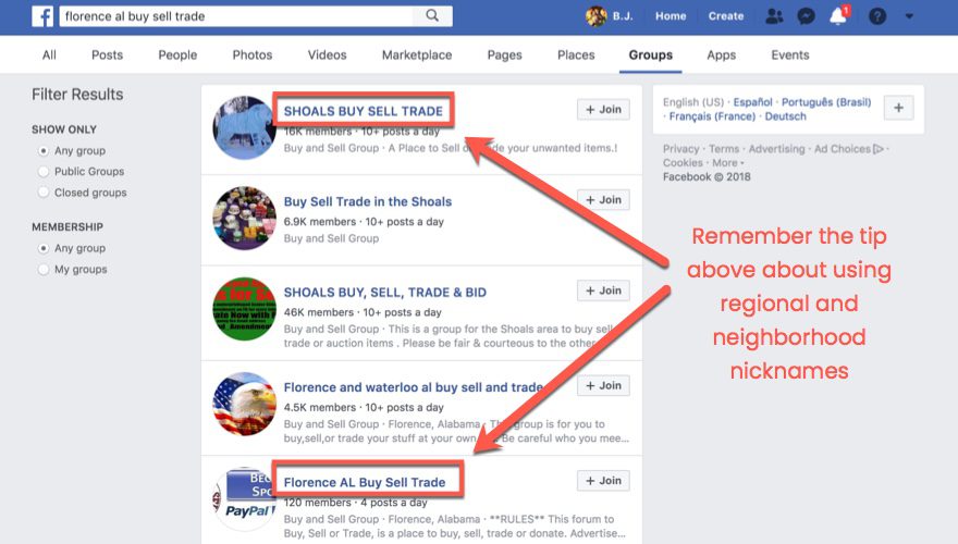 Finding these groups is pretty straightforward. Simply searching (inside Facebook) for MyCityName buy sell trade will likely bring many of them up. For my local area, the term sale barn is popular for groups, and other keywords like swap and marketplace and bazaar tend to work their way into titles.