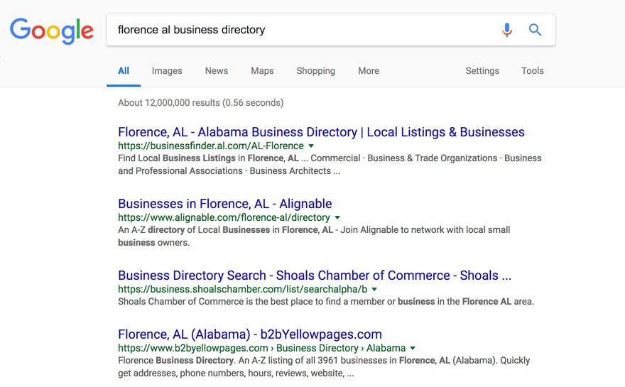 Your local Chamber of Commerce probably has a directory of local businesses that are members. Those are links with good domain authority (probably) and generally decent traffic. You may have a state-wide directory like Alabama does through AL.com. Note that our local Chamber of Commerce shows up.