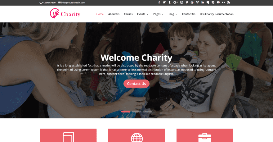 Divi Charity comes with 9 pages including Causes and several for Events. The home page displays a full-width slider with a contact CTA. Following this is a set of blurbs with donation information. A section for the latest causes shows them in large cards with an image, description, read more link, and amount and goal information. It also includes information with images, number counters, blurbs, and styled blog cards. The Causes page displays the causes as blog cards with the goal and raised amount. The Events page shows events in cards that look like blog posts. The Events Details displays them as single blog posts and includes recent news. Images include lots of hover animations.