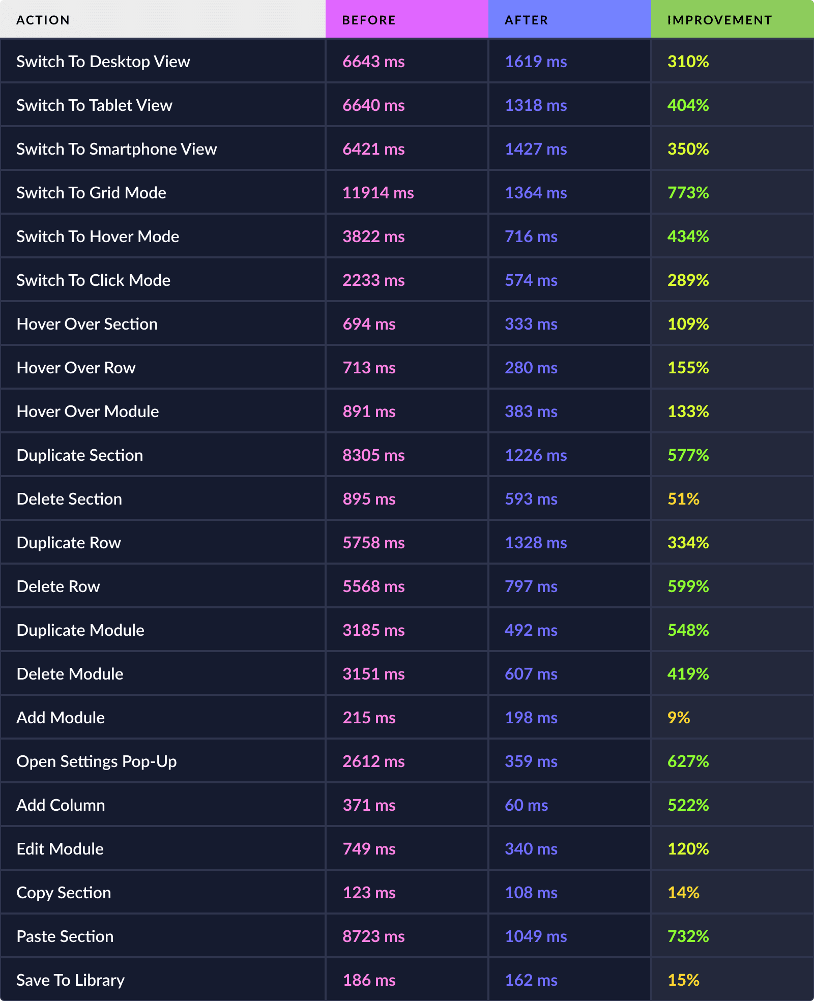 Let’s jump right into the stats. After months of work, we ran the profiler on the new version of Divi and compared its speed to the old version of Divi. We used a complex layout to make sure that each action was slow enough to reduce the affect of minor anomalies (that’s why the spreadsheet shows higher numbers than you might have experienced personally). We ran the test three times for each action and then compared the averages. Here are the results 👇