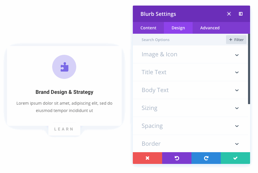 The new system also makes it easier to identify relevant elements on the page while navigating module settings. As you search through options, Divi will indicate which module element each option group belongs to. You can quickly hover over the list of options and use the visual cues to identify your desired settings and begin customizing each element.