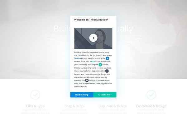 The very first product tour that we are launching with today is the “Introduction To The Divi Builder.” The first time you launch the Visual Builder, you will be now be greeted with an informational popup along with an instructional video and an invite to take the tour. This tour is only shown once. You can skip it and you can also disable the tour in the Divi Theme Options.