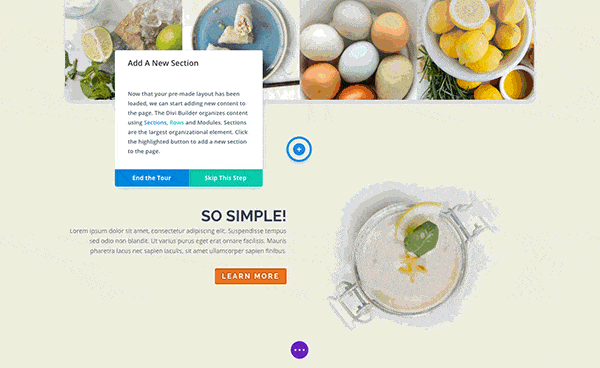Once the tour begins, it will guide you through all of the Divi Builder basics while you create your very own page. You will learn how to load layouts, add sections, edit modules, drag & drop, copy & paste, adjust design settings, preview your page on mobile, navigate your editing history and save your page! It really makes your first experience with the Divi Builder much more inviting and much less overwhelming.