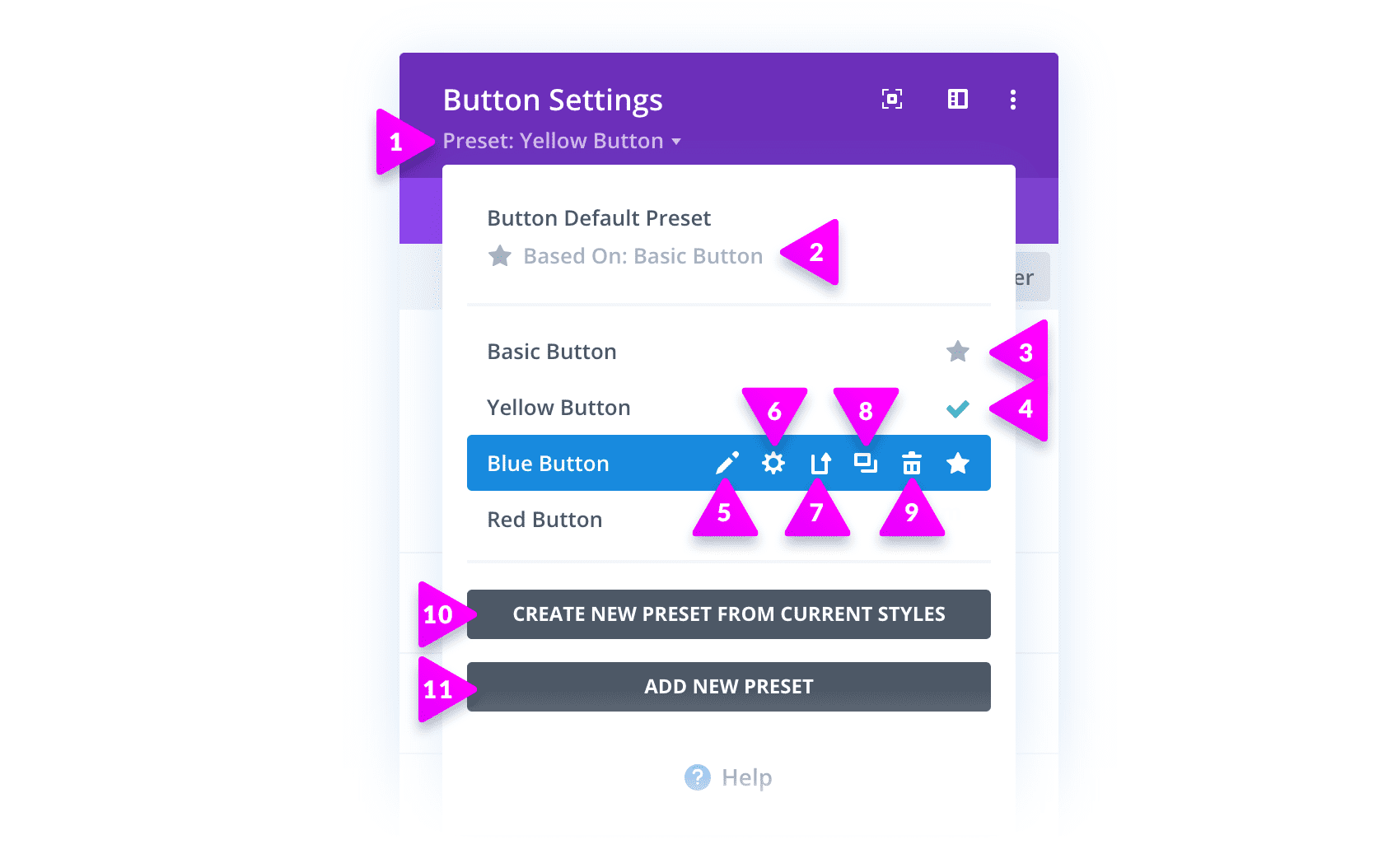 - Assigned Default Preset – This star signifies which preset is currently assigned as your default preset. All basic modules will use this preset as their default appearance. Click this star icon within any preset to make it the default preset.