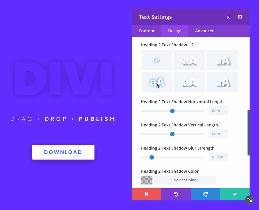 Adding and customizing text shadows is easier than ever thanks to Divi’s shadow presets and a full range of text shadow controls.