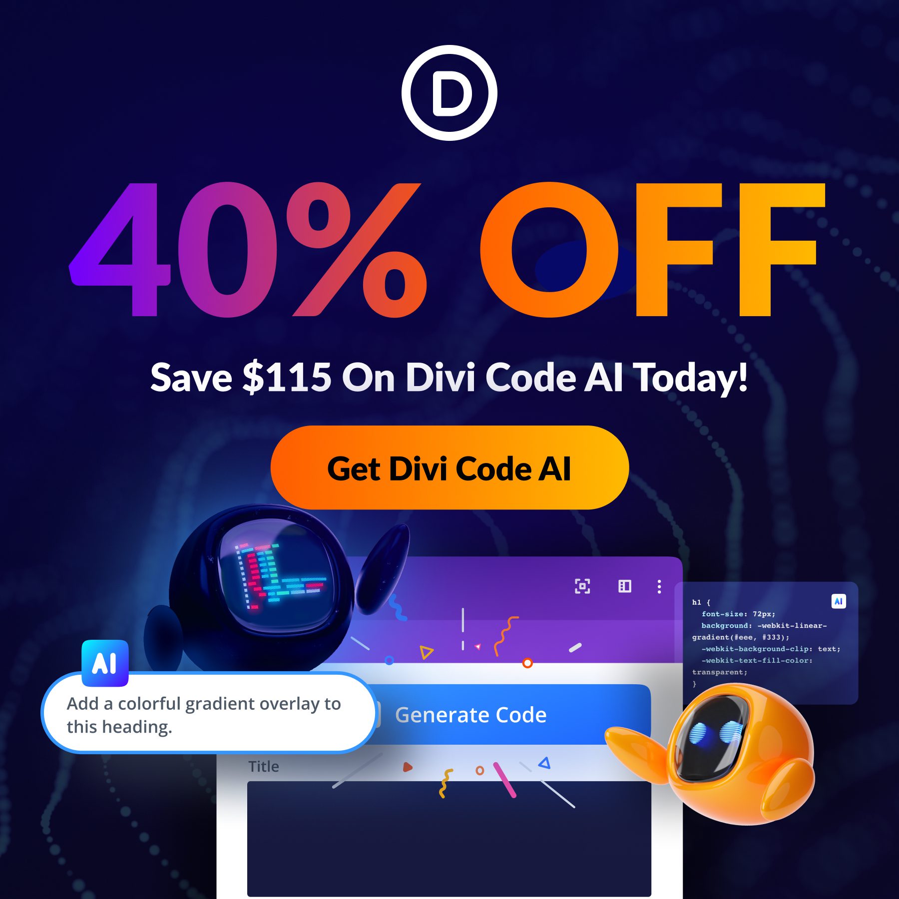 To celebrate the launch of Divi Code AI, we are offering 40% off Divi AI for the next week. Anyone who purchases Divi AI before the sale ends will save $115 per year and lock in those savings for life! Plus, all your team members can use Divi AI at no additional cost. Get the discount here 👇