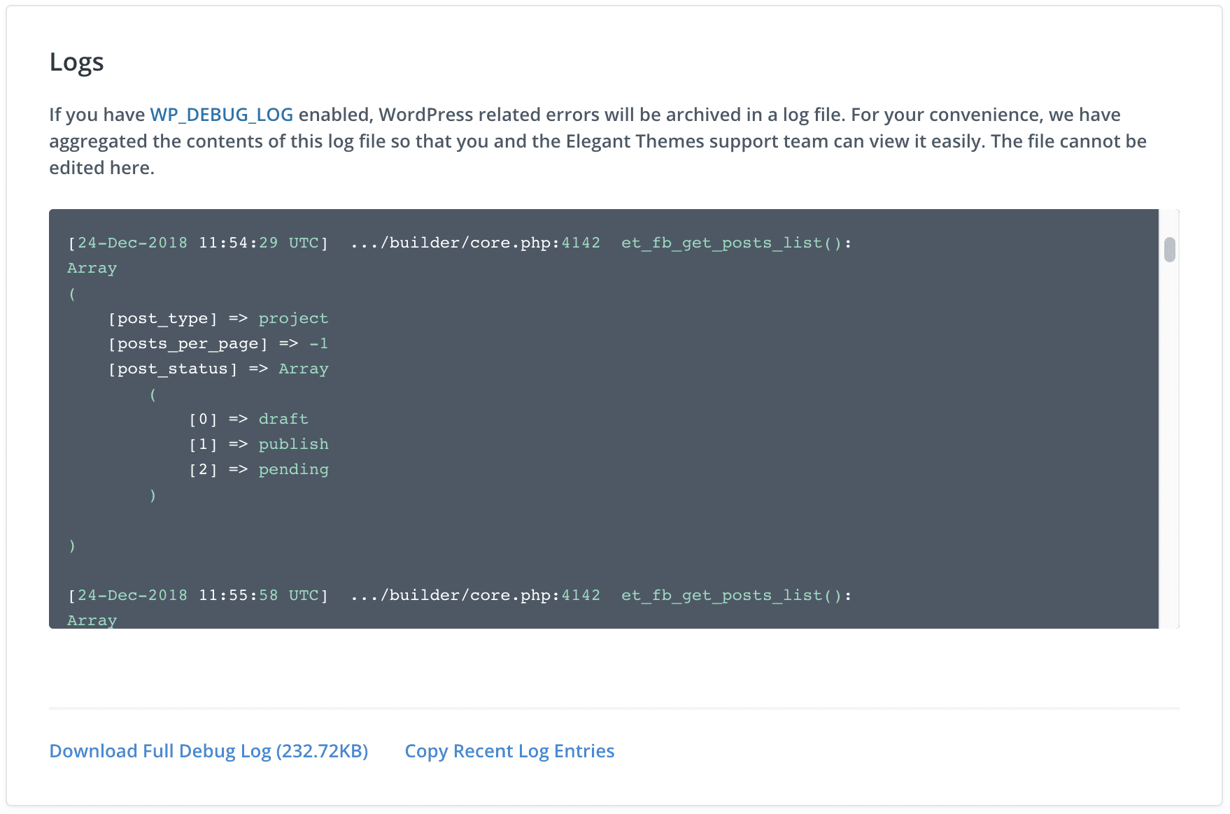 Finally, we have the Debug Log section, which gives you and our support team easy access to all of the errors and warnings that have been occurring on your website. This can give you and our team insight into what the cause of any particular issue might be. In the past, we have had to request this information, which caused unnecessary back and forth during support chat. Customers were often unaware how to find their debug logs, which means even more time was wasted contacting their host for assistance. The Debug Log is super convenient and saves a lot of time.