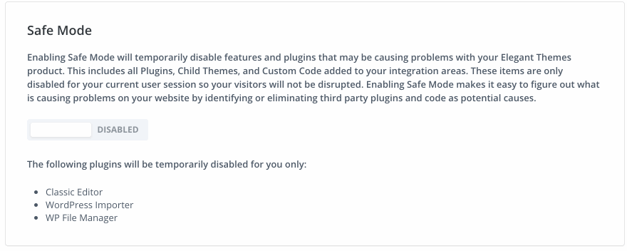 The next feature of the Support Center is Safe Mode. The bulk of problems that people experience while using Divi are compatibility related, which is natural considering the open source WordPress ecosystem. Sometimes there might be a problem with your child theme, third party plugins or custom code. Traditionally, the only way to figure out what was causing the problem was to disable your child theme, all of your plugins and your custom code at once. However, this took time and could cause disruption to your visitors. Website owners were often unwilling to take this step, which made it impossible to figure out what the problem was. Safe Mode solves this issue.