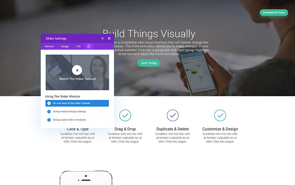 Whenever you are using Divi, no matter what you are doing in Divi, we want there to be a lifeline for you to reach for just in case you get stuck. We are currently working on a brand new tutorial series for the Visual Builder and an integrated help system that will allow you to watch video tutorials and follow along with them right inside the builder while you are using it. Again, this will not only be a great tool for new customers, it will also be integral in the process of handing off websites to your clients.