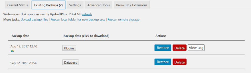 Selecting Existing Backups shows the backups you’ve created. If it’s stored on the Google Drive you’ll see the Google Drive icon under the date. In this example I have an old backup that’s stored on the server and a new backup (just of plugins) that’s stored on my Google Drive.