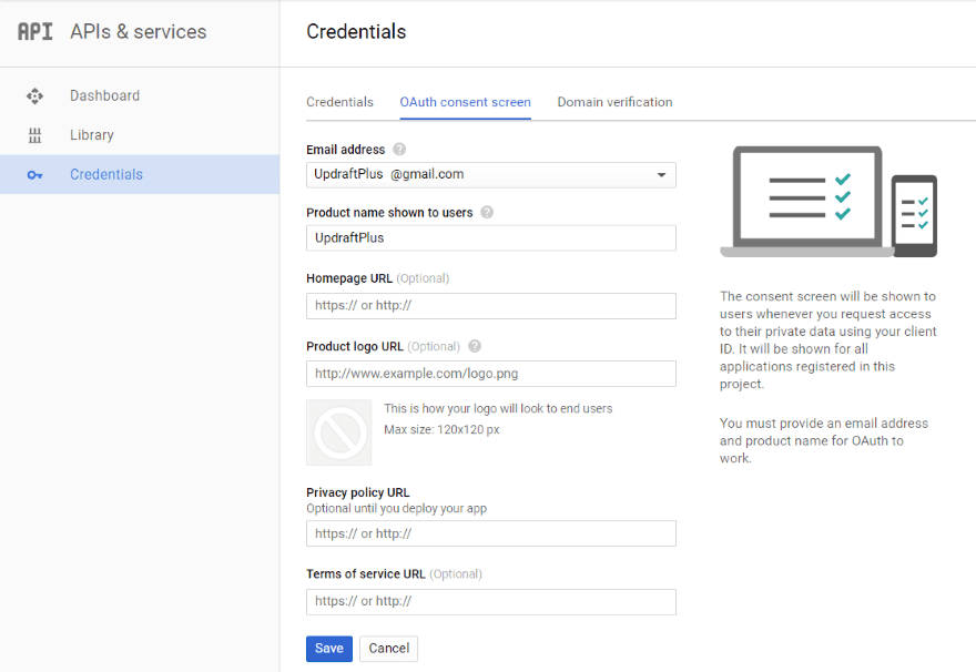 Select Credentials and then choose OAuth content screen. Fill in the fields and click Save.