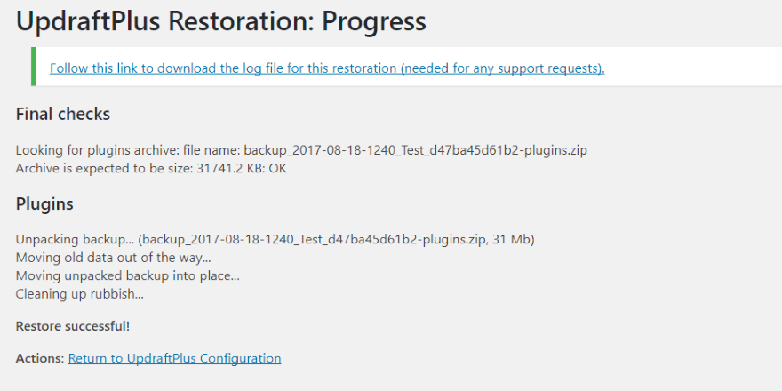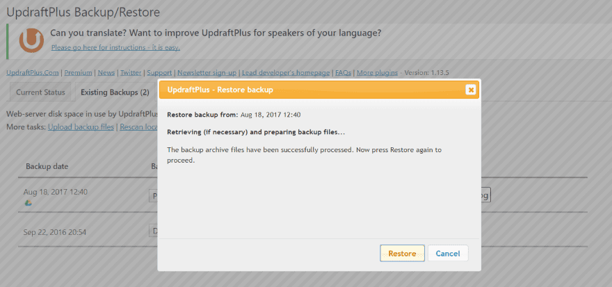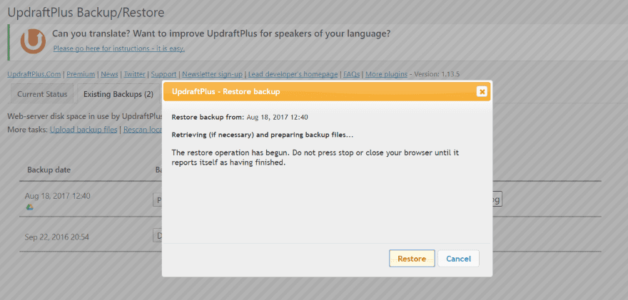 UpdraftPlus will retrieve the files. This might take a few seconds or a few minutes. Once the files are processed you’ll have to click Restore again.