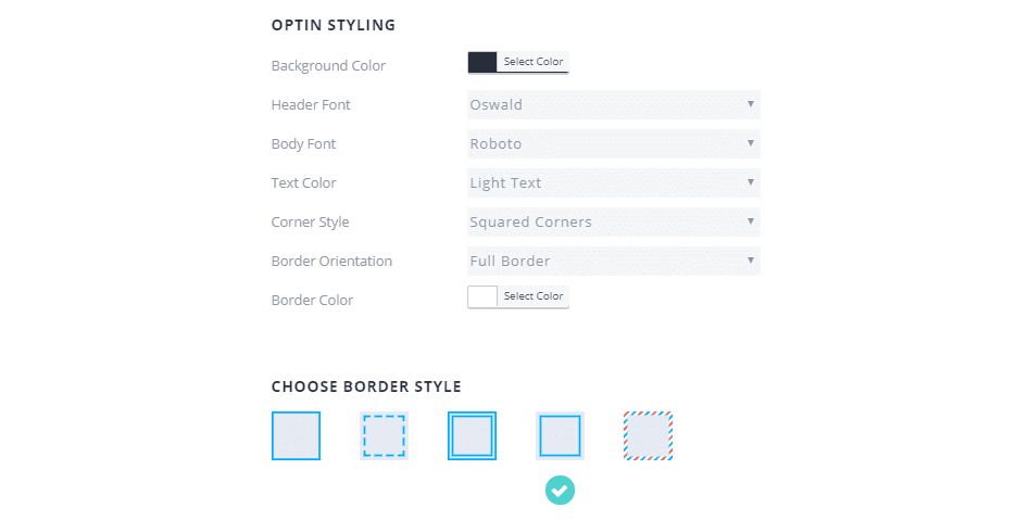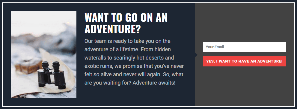 For fonts, the travel website layout back uses Oswald for headers and Roboto for the text. We can do the same thing here to maintain continuity. The same for squared corners, and I think that the use of a full border with a single, white interior rectangle (the fourth option with color set to #ffffff) makes the opt-in pop just enough to be noticeable but not look out of place.