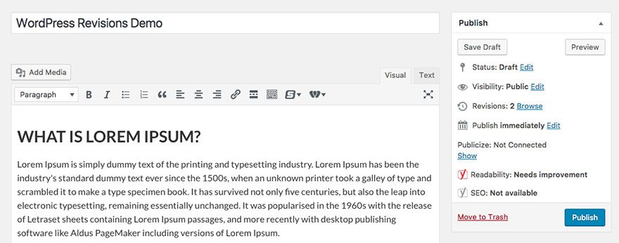 By default, the Revision feature is automatically enabled on every WordPress installation. If you’re not seeing the Revisions option on the post editor and you’ve made changes to your post, chances are the Revisions feature has been disabled at the configuration level.