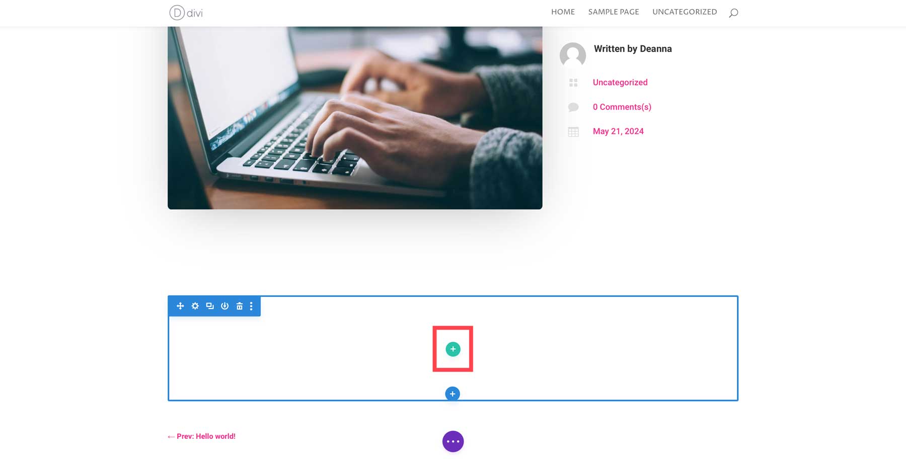 Our template takes care of the title, featured image, and post details but doesn’t include the post’s content. We’ll enlist the help of Divi AI for that. Scroll down to the post section where you see a blank section.
