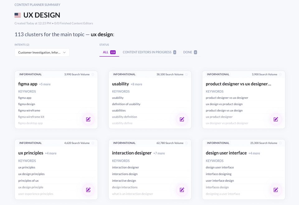 According to Surfer, “Every box contains a list of keywords to be targeted with one piece of content” and “each cluster has a search intent that it’s related to.” That cuts out a lot of work for you, and you can get started on creating content right away.