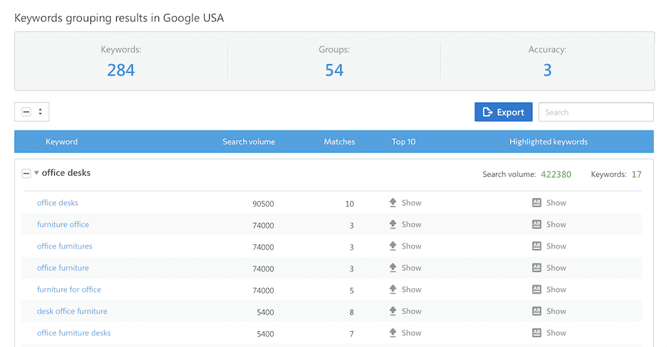 Whichever type of keyword grouping you choose, you can export the results as a simple spreadsheet with Group and Keyword columns.