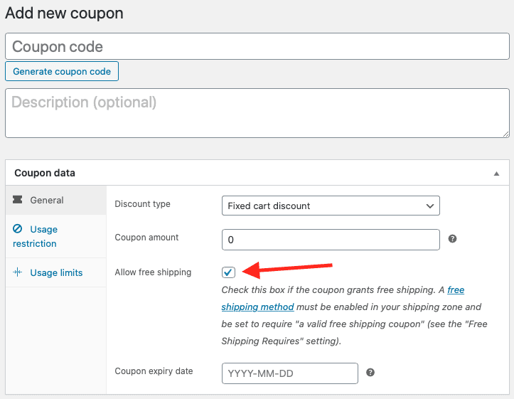 Furthermore, you can create a coupon for free shipping. Under “WooCommerce” in the left sidebar, click “Coupons.” When you create your coupon, check the “Allow free shipping” box.