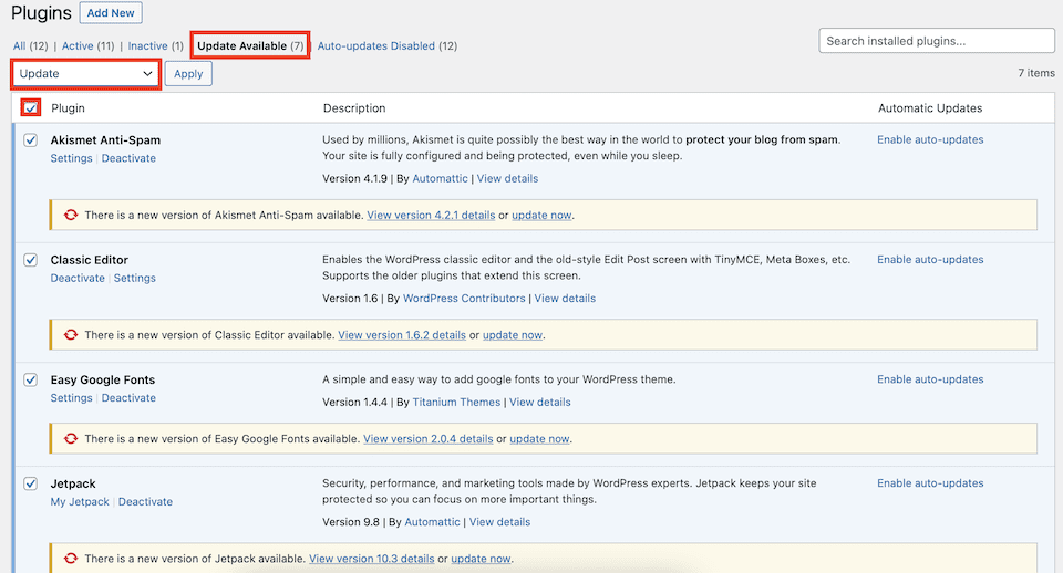 You can also set plugins to automatically update. In the screenshot below, the first plugin is already set to auto-update, while the second one still has the option that can be enabled.